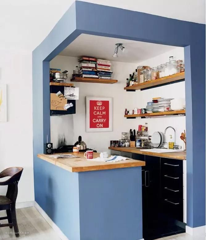 小户型装修真的很头痛,没有单独的厨房空间,所以在装修设计的时候不知道如何做。今天给大家介绍一个这样的聪明设计,砌一堵墙留一半,围着整个厨房打一圈柜子,一半当餐桌一半做储物柜,灵活性非常高,赶紧来看看吧。