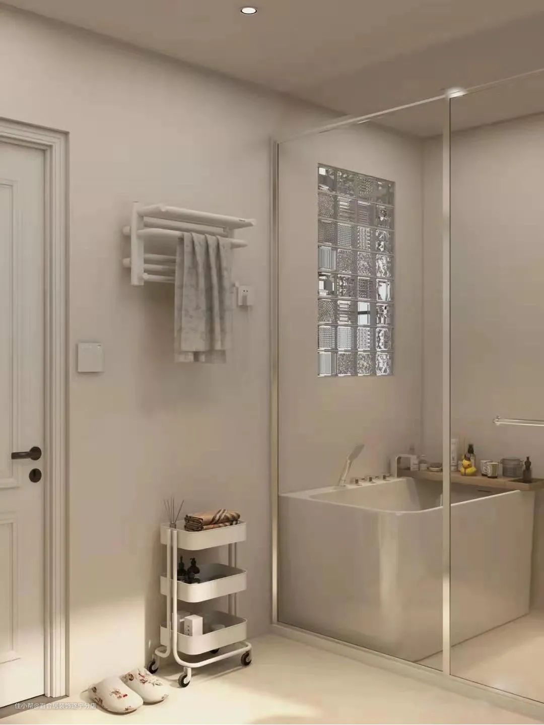 卫生间是微水泥的奶油色设计,质感高级,屋主选择了色调统一的浴缸、浴室柜,玻璃装饰是好看的“小心机”,既实用又有氛围,洗澡的时候心情都会放松下来。