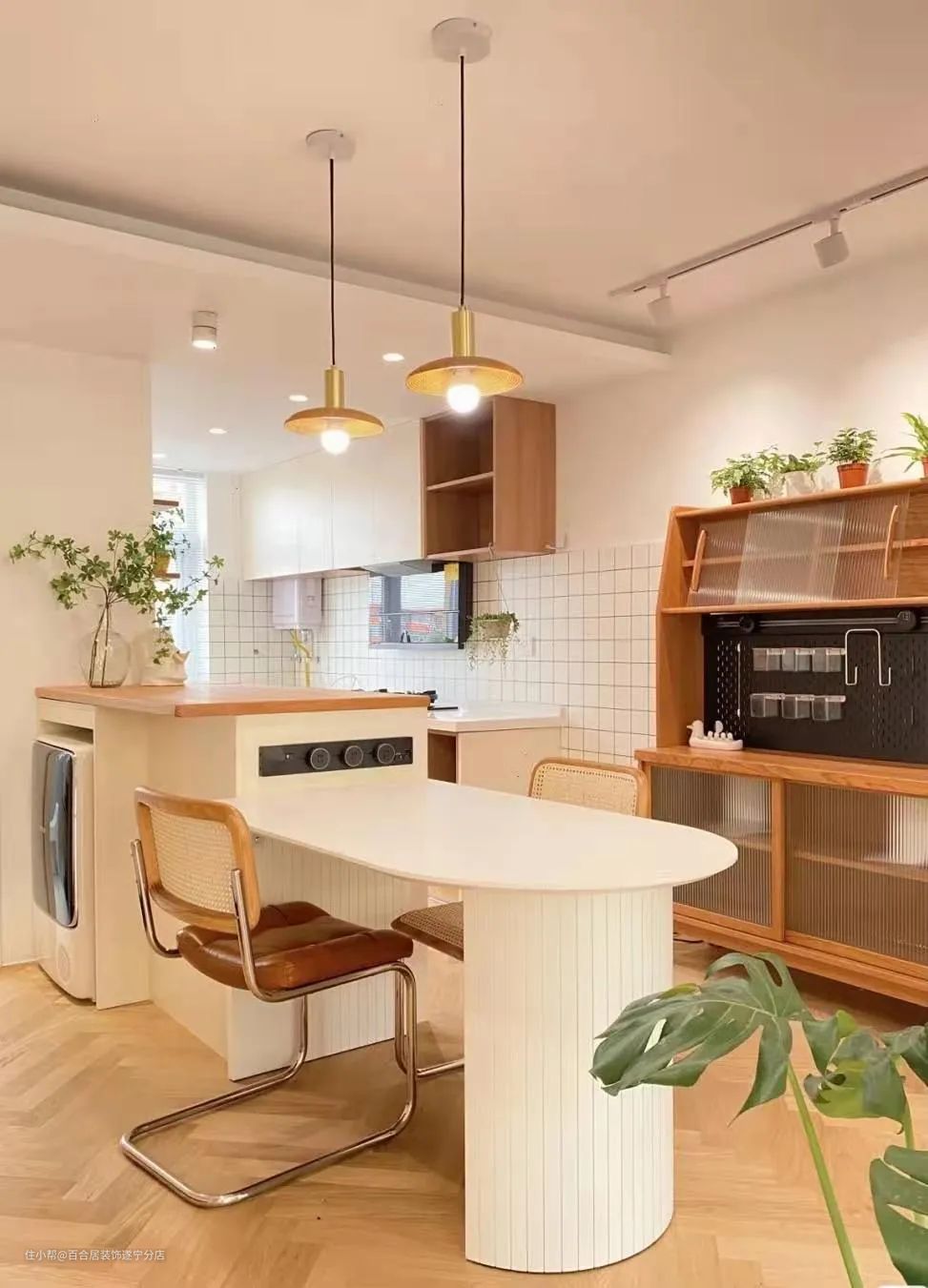 想要更休闲居家的奶油风可以参考上图,加入了咖色和原木色,温馨中透着日常生活的随性,屋主人为了能更有生活气息,加入了很多自己喜欢的绿植,这点大家也可以直接抄作业。