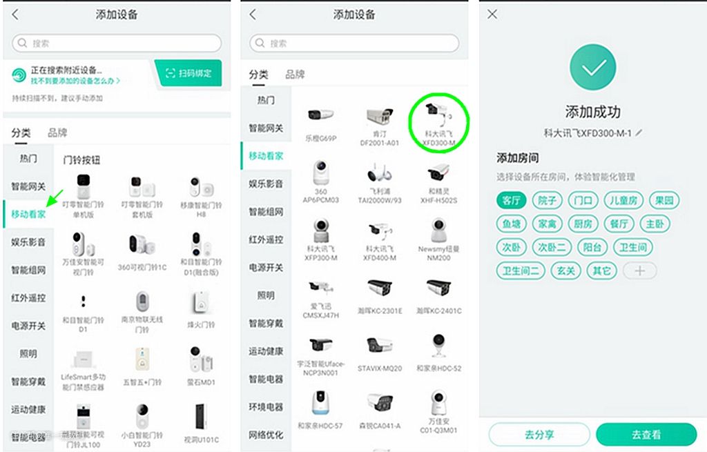 科大讯飞XDF300-M摄像头是由科大讯飞与和家亲深度合作定制,下载使用“和家亲”可以进行摄像头的绑定,使之成为和家亲智能家居的一员,设备绑定根据向导来,提供两种绑定操作方式,其一为直接搜索产品进行连接,这个比较简单,不用细讲。其二为通过分类查找,找到《移动看家》分类,然后找到《科大讯飞XDF300-M》进行连接即可。