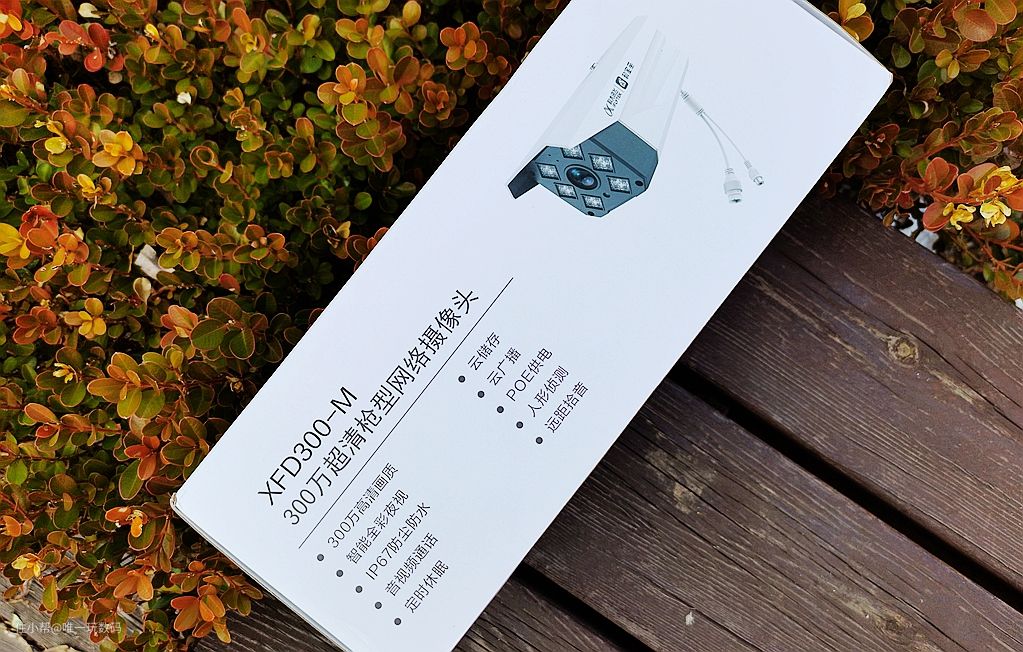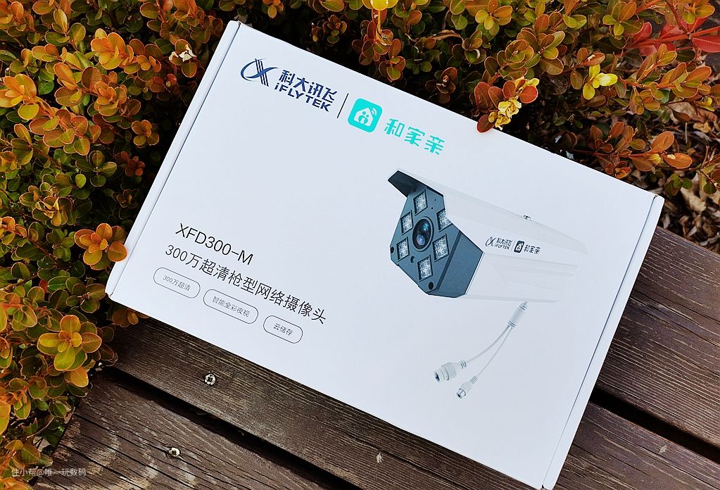 科大讯飞&和家亲摄像机外包装很简洁,从外箱上可以看到摄像头的渲染图,这款摄像头为枪机形式,由和家亲(中国移动物联网技术公司)出品,与科大讯飞强强联合的产品,名称为300万超清枪型网络摄像头,型号为XFD300-M。