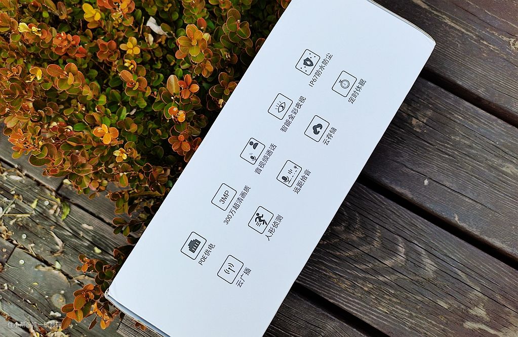正前方则展示了产品的主要亮点,300万高清像素、智能全彩夜视、云储存&云广播、POE供电、人脸识别、IP67防水等,可以说罗列的非常清楚。