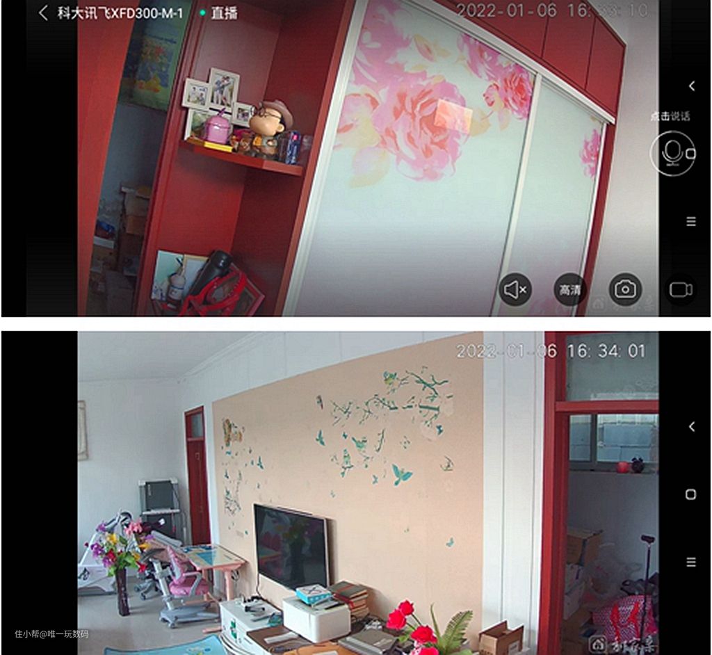 科大讯飞XDF300-M摄像头:对于家庭来说,只要家里有网络即可,WIFI或有线网络都可以正常使用,同时不用什么显示器,直接连接手机就可以用手机随时随地观看实时动态,还有报警、语音对讲、视频对讲等等功能;