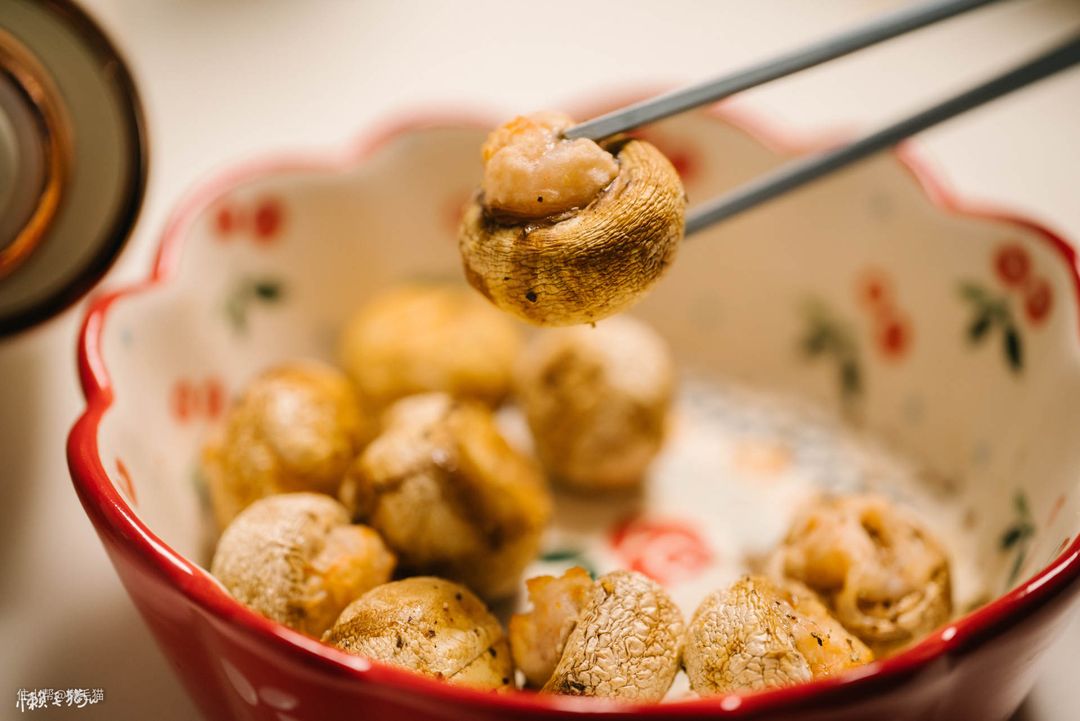 做法也非常简单,把口蘑的柄掰掉,把虾滑挤进去,然后摆在空气炸锅里,设定180度8-10分钟就可以了。