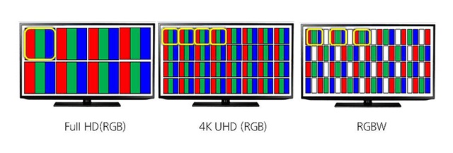 假4k则是由红绿蓝白(RGBW)组成像素点依次排列。