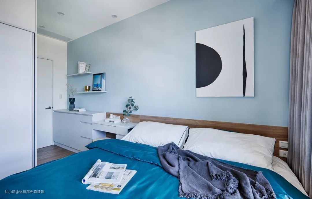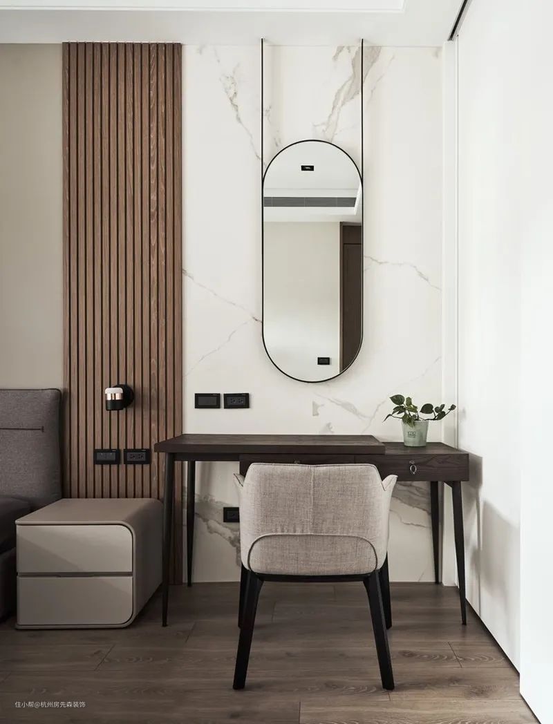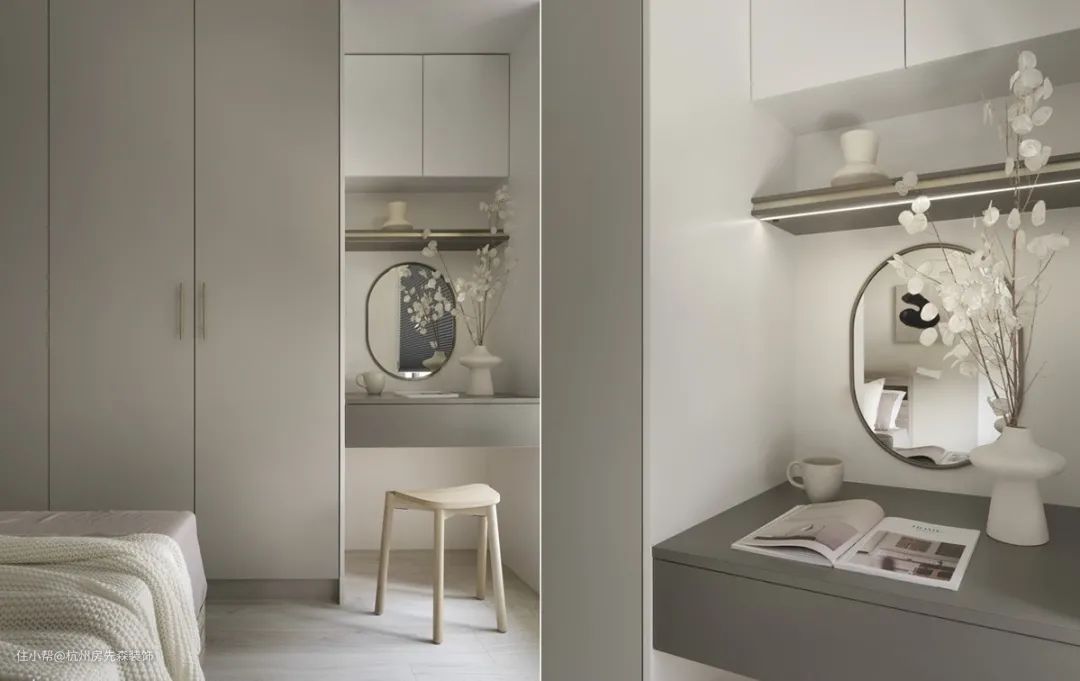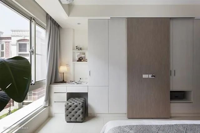 将化妆台揉合衣柜,以一体到位的形式,既可节省空间,也能提升使用面积有效性,尤其若有镜对床的顾忌,不妨增加门板使化妆台隐现自如。