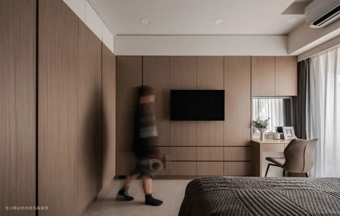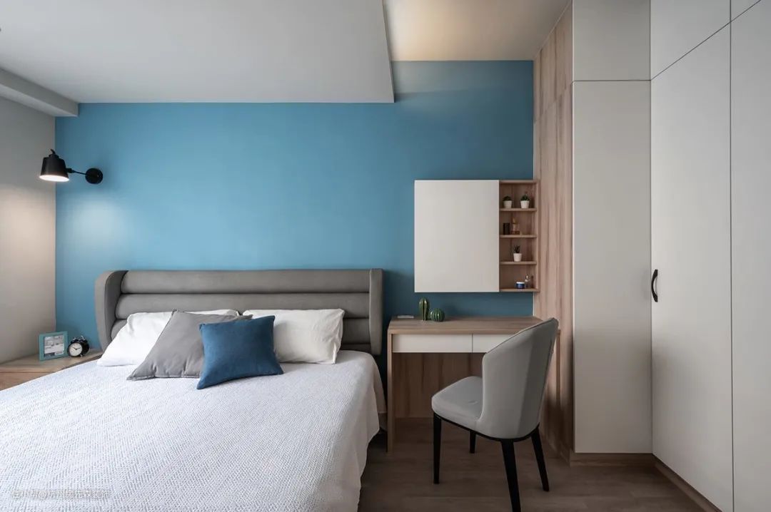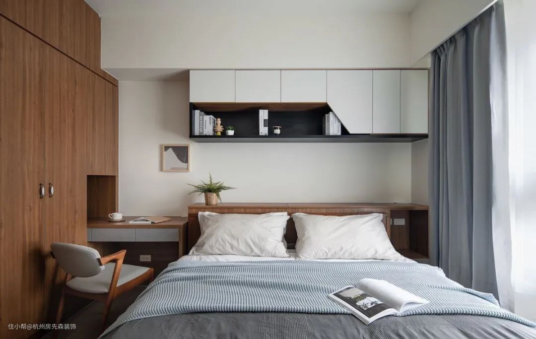 不只可与衣柜相互整合,也可沿着床头墙延伸出柜面,无论当作书桌或梳妆台都十分合用,此外,若侧墙有设置衣柜,亦可将台面持续拓展,使用范围即可大幅扩增。