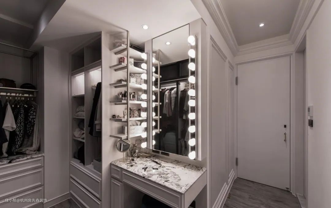 豪华主卧室必备空间,在此处摆放一张梳妆台,不仅容易搭配妆容与穿搭,就连所有小饰品、皮包配件等都能在此全部完成,适合主卧房面积大、且追求奢华氛围的女孩!