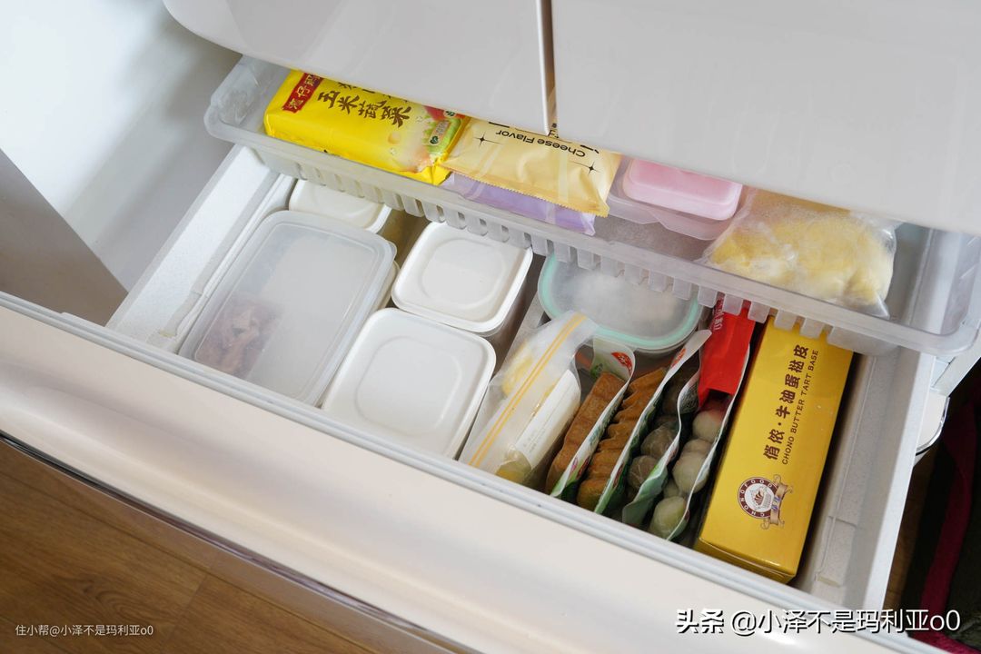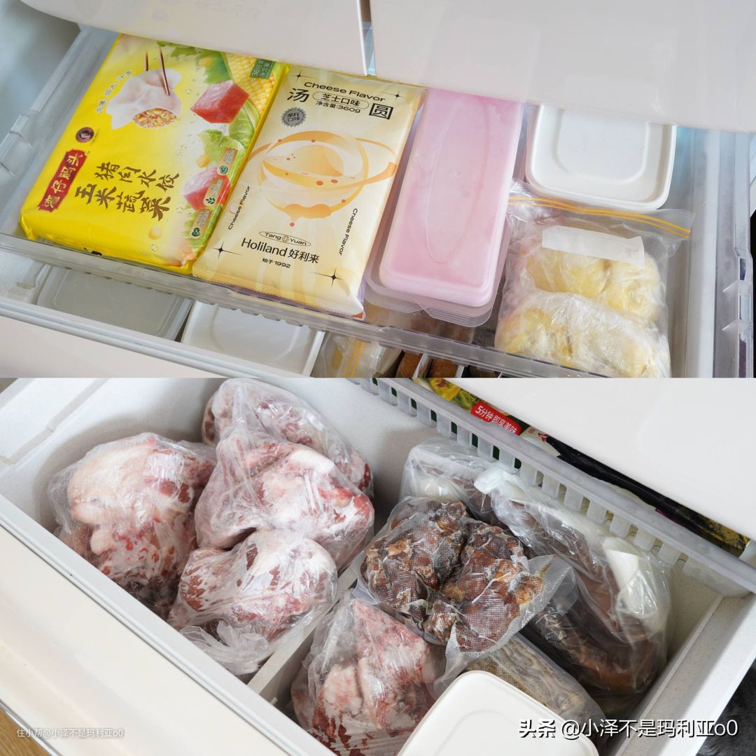 还有一点就是如果大家和我一样冷冻室是抽屉的话,尽量把食材竖着摆放,不要一层层叠放,这样找东西会更加方便。在存放时也建议按物品类别放置,比如我这一层放的都是烘焙和火锅食材,物品摆放就很清晰,找起来很快。