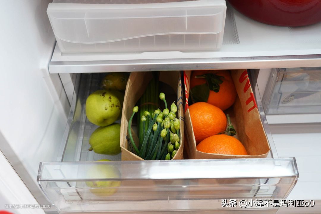 冰箱的抽屉,直接把东西放进去乱糟糟的,拿取都不方便。这时候可以用牛皮纸袋当作抽屉分割,把果蔬横向分隔开,提高抽屉的空间利用率。而且牛皮纸袋可以根据食材形状改变,比塑料收纳盒更加灵活。