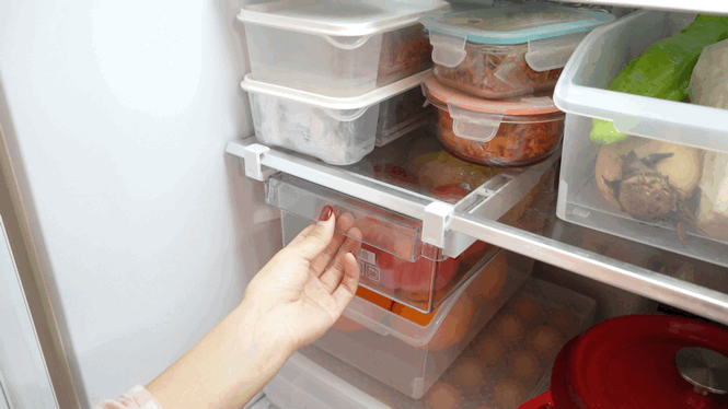 在原有的层板下方,可以加装这种抽屉式收纳盒,它能够有效地利用上层空间,对冰箱进行扩容。