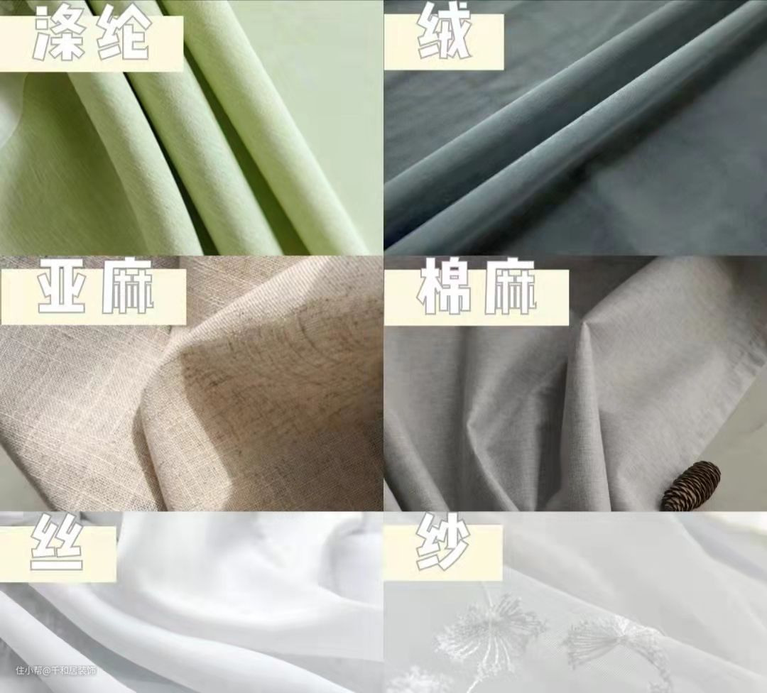 市面上窗帘布料有:纯棉、亚麻、棉麻、绒布、涤纶、纱质、百叶等等。