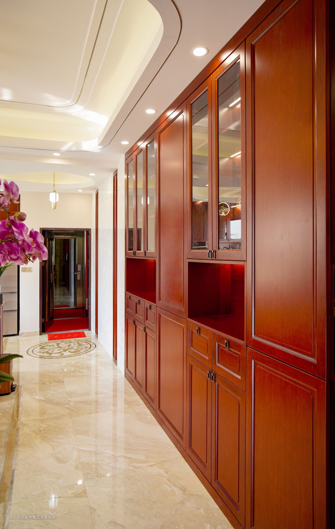 室内发扬建筑新中式的风格,以沉稳、内敛的传统文化为基点,为增强顶楼复式大气的空间感,统一采取巴西花梨色调柜体,沉着内敛的大地色天然大理石肌理铺陈地面,在高贵与亲和间自然过渡,这也呼应着业主的生活品味与人相处的随性温和。