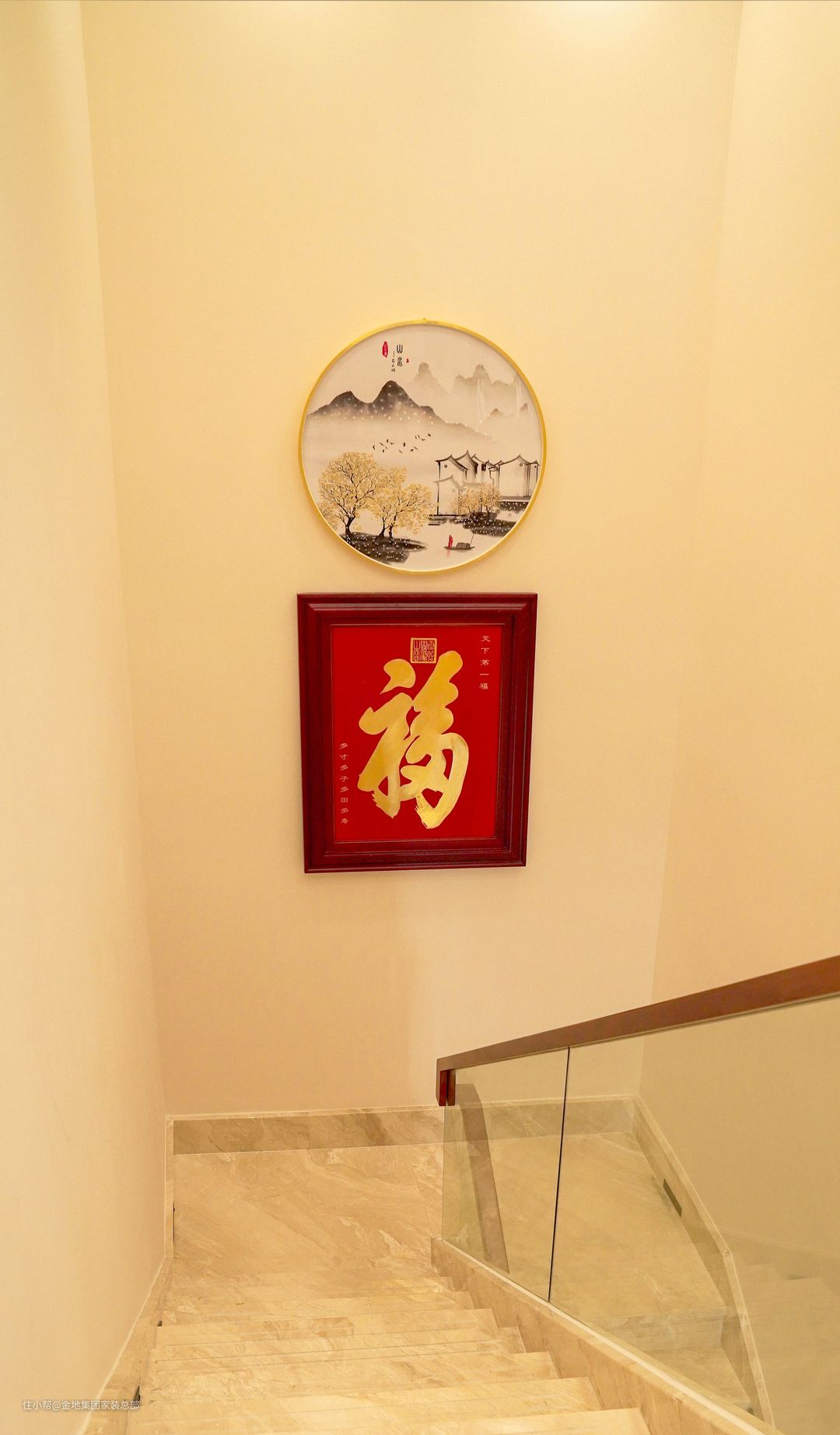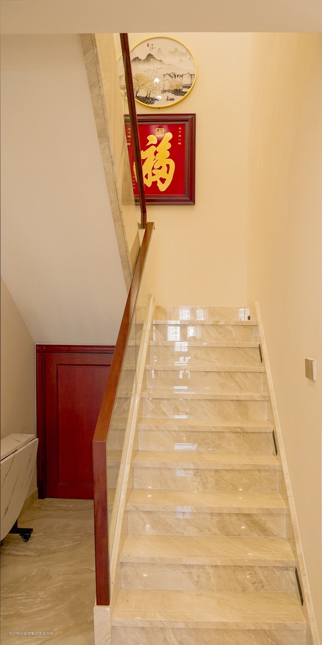 楼梯的打造是空间的重点,采用暖灰色大纹石材铺设通铺与地面一色,搭配金色的槽线,含蓄而张扬。玻璃挡板与木色的扶手的组合,有若“淡淡流水载轻舟,悠悠鱼儿水中游”