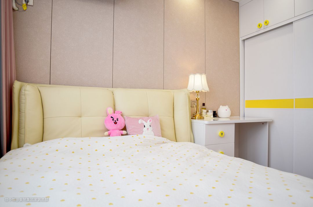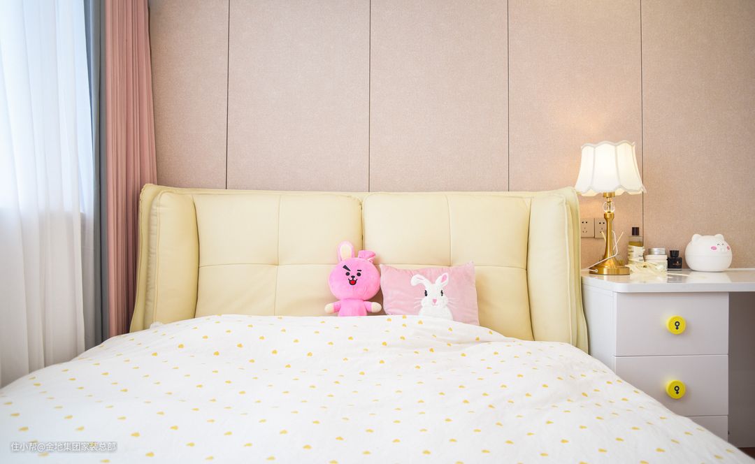 女儿的房间总会让人联想到粉色甜美的公主梦,在这个空间里整体就采用了杏粉色调为主色,墙面采用帘幔造型,增加空间的层次感,大面玻璃窗阳光充足是的房间通透明亮。