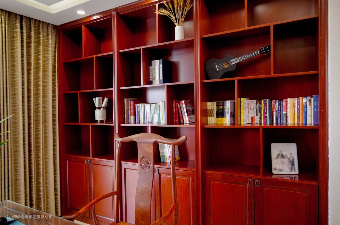静心品书、修身养性的独立空间。以简雅之器与古博之书突显温润有礼的人文气息。正所谓秋敛冬藏,红木色的沉稳内敛,点缀一丝青铜色拉手,秉持整个空间古雅大气的调性。