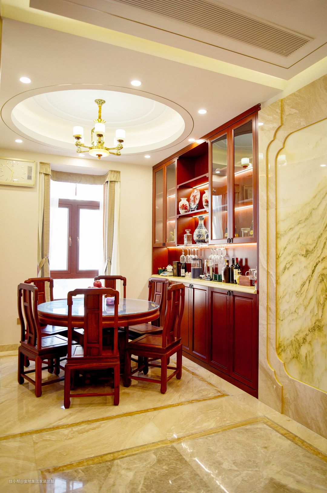 圆形吊顶,方形地线与圆桌方椅彰显东方人为人处世方圆有度。大理石与胡桃木,一刚一柔,奢华不失温度。当三五好友来访,小酌雅聚,书香望族的待客礼仪在此升华。