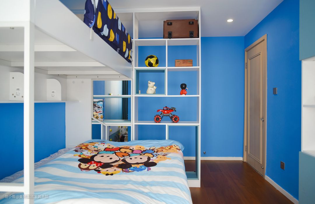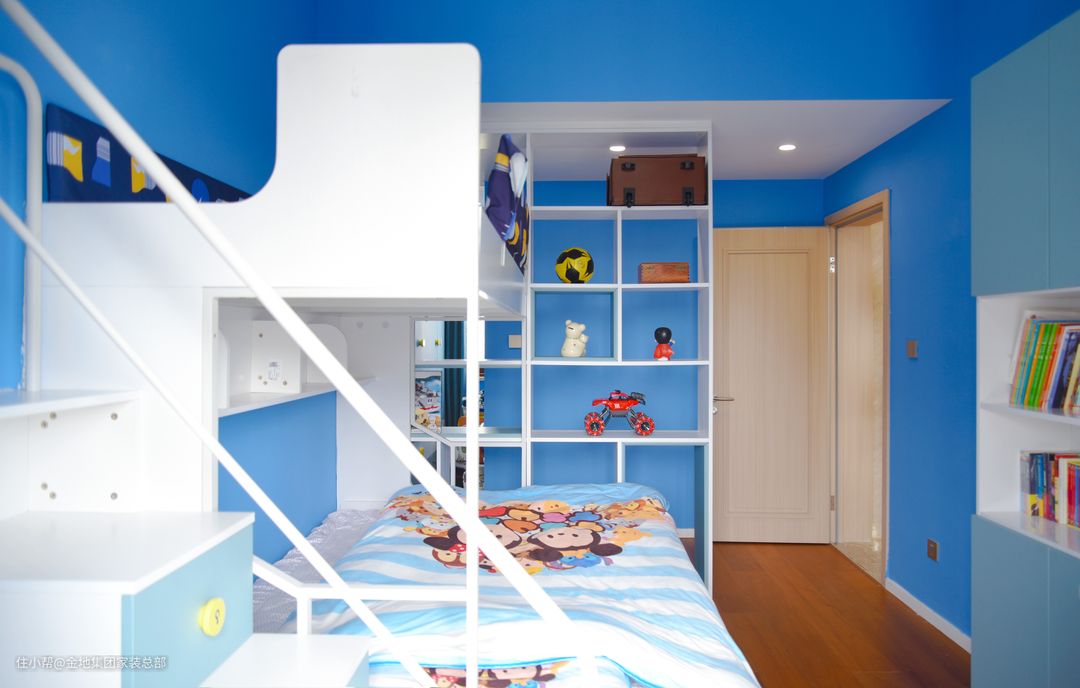 男孩房以蓝色为主调,搭配白色床品,整体呈显蓝白灰调性,更有年轻个性的体现,对生活热爱的向往。巧妙地定制了床体、书桌与储物的设计,将空间的利用率大大地提高。