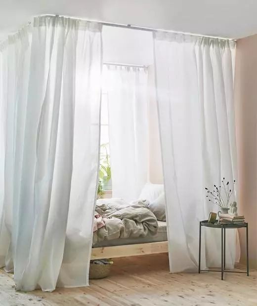 既然纱帘这么有诗意氛围,为什么不多装几层呢?两层纱帘加一层棉麻的布帘,这样的组合打造私密空间,超级上镜。别看纱帘轻盈,但是比大部分遮光窗帘都耐洗,因此清洁也没有大问题。
