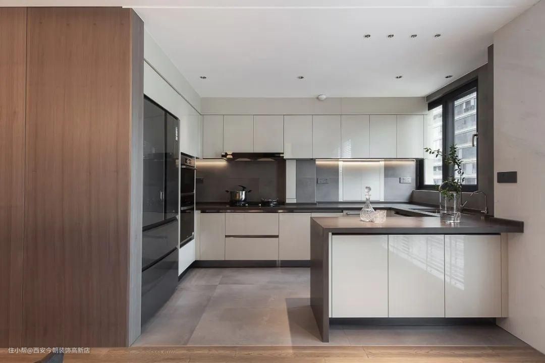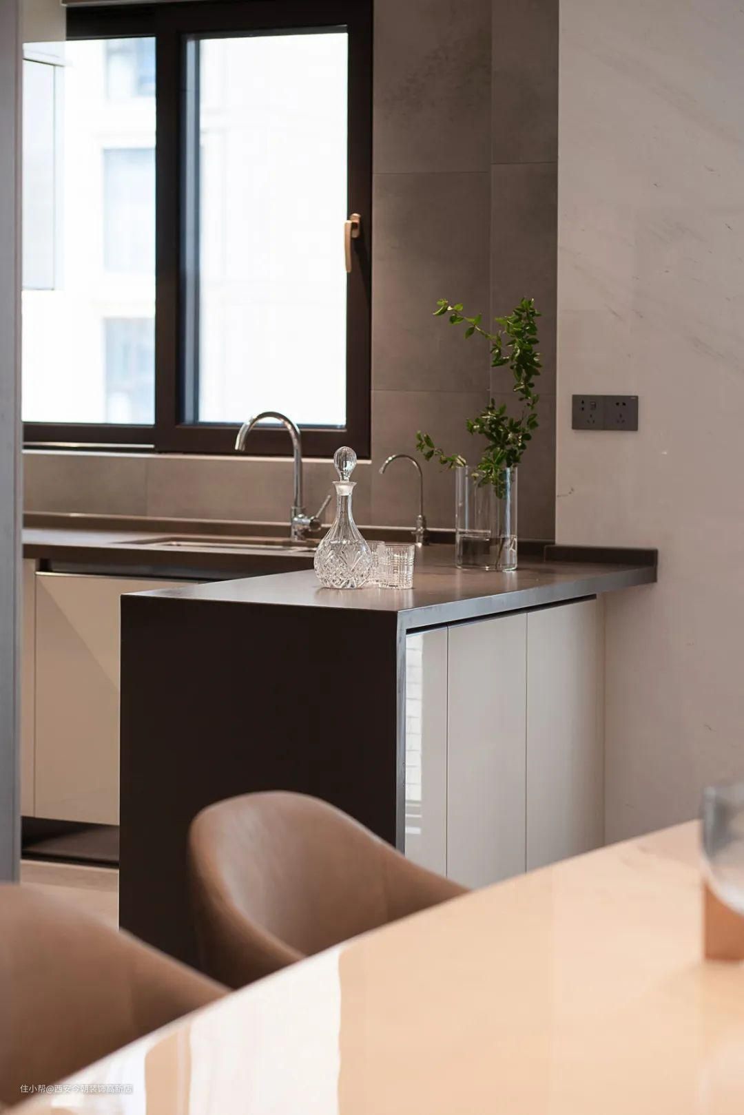 基于他们的生活习惯与方式,厨房采用了敞开式设计,高柜加低柜组合满足丰富的收纳,半岛式吧台的设置可以灵活使用。厨房与餐室之间没有切隔,光线和视野可以自由游移,加大既有空间的明亮感和通透性。