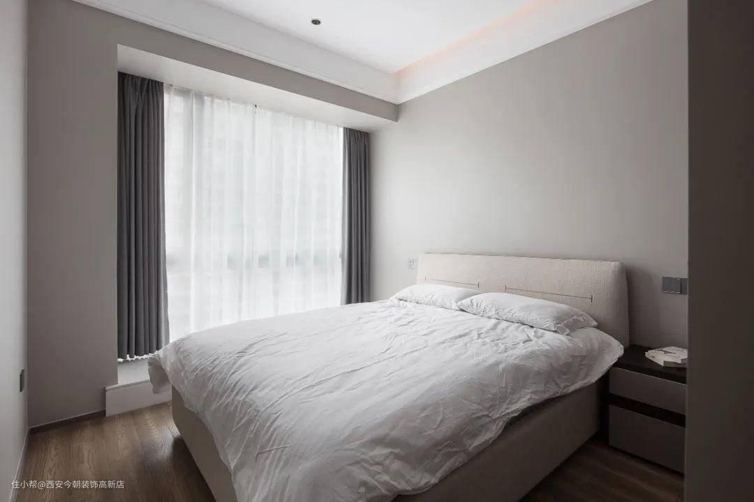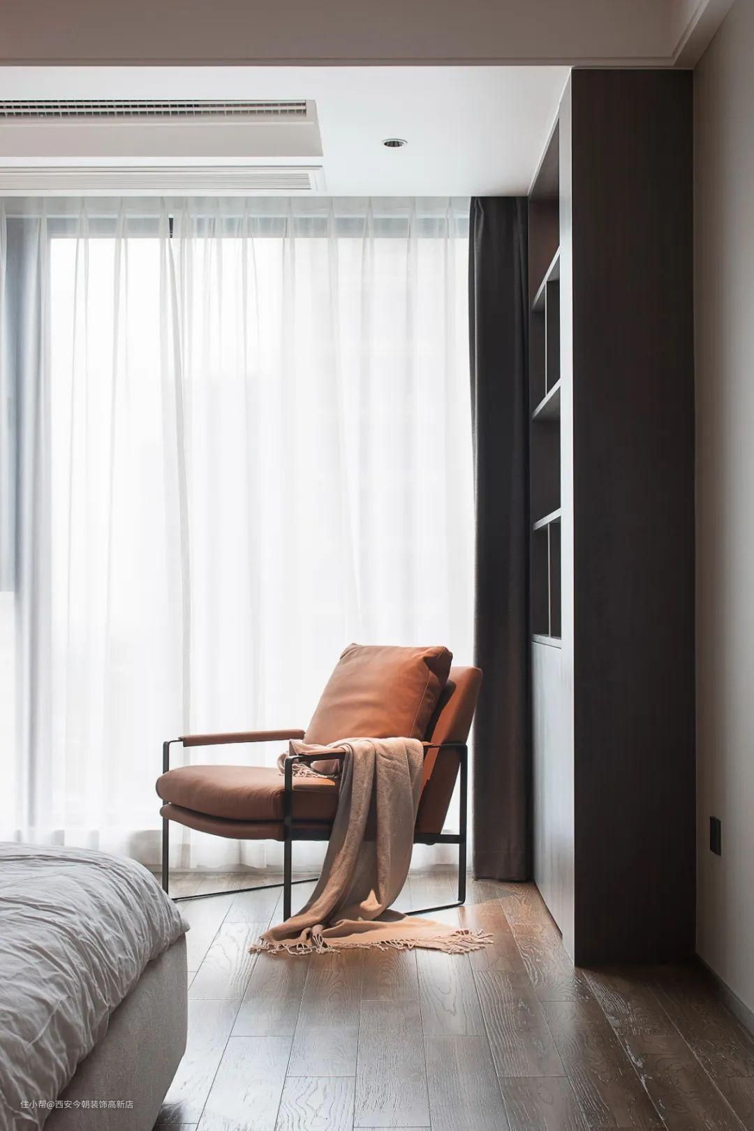 次卧采用整面墙体的落地窗设计,充足的采光带来一室透亮,宁静的光影在木质地板间倾泻温柔,营造出温暖、惬意、明媚的氛围。