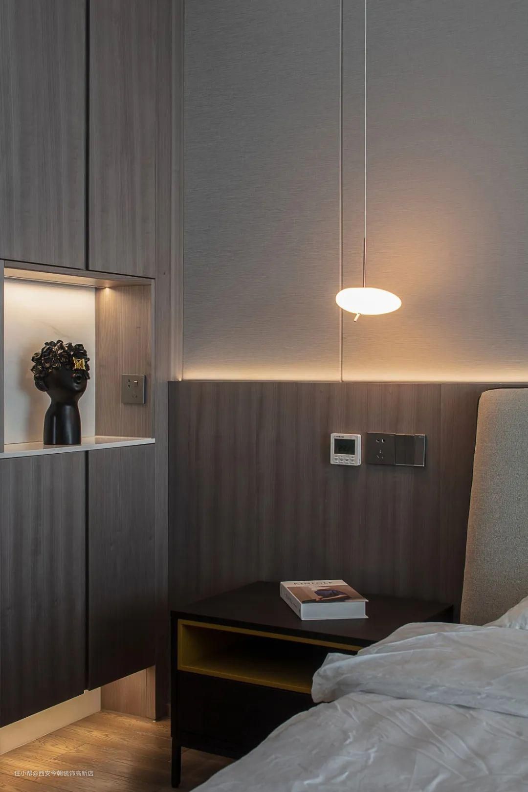 主卧全室延伸深色元素为空间轴心。背景墙板块式肌理融入冷静的空间态度,增添了细腻灵动的情调。不同的质感延展出不同情调的空间视觉,抹去冗杂,令人不自觉的释放出真实自我,有生活,有温度。