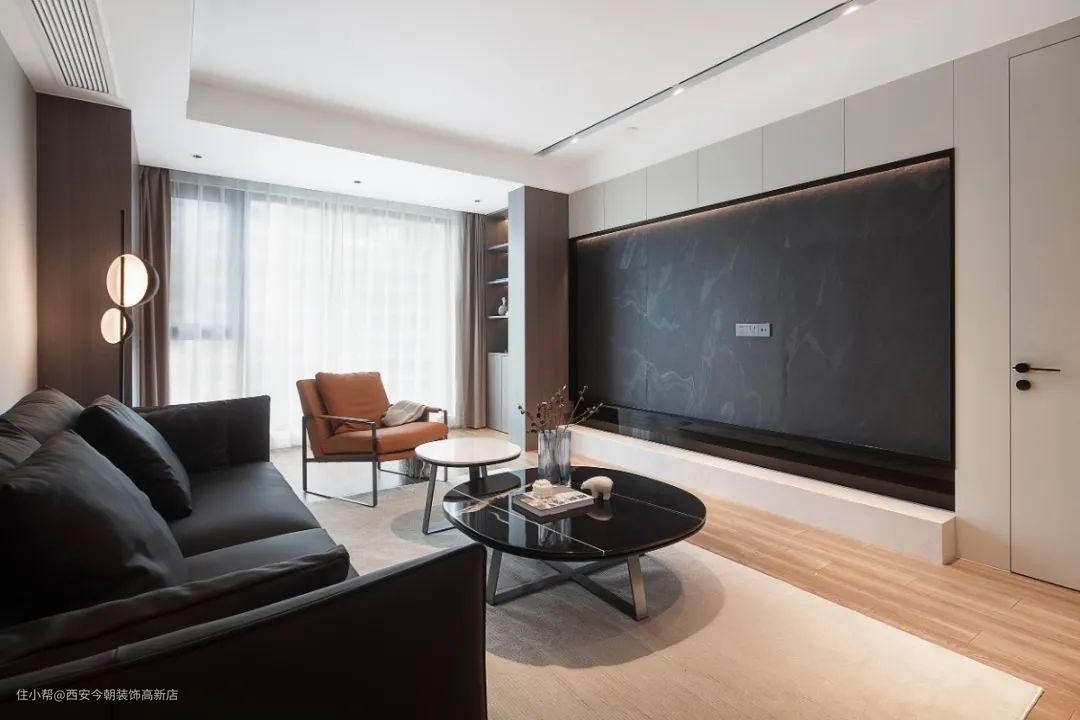 连贯的材质规划贯通这个空间中心,墨色纹理岩板电视背景墙作为主视觉延伸,搭配艺术流线型木地板,透露出空间个性,象征着对未来感的触碰,静与动的力量带动着空间节奏,奏响于此。