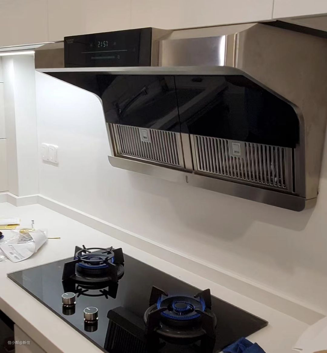 新住建议:除了上述的两种之外,现在也有顶侧双吸的7字型油烟机,外形虽然有点丑,但顶吸+侧吸双重吸力,可以达到油烟不过脸,且近乎零逃逸的效果。