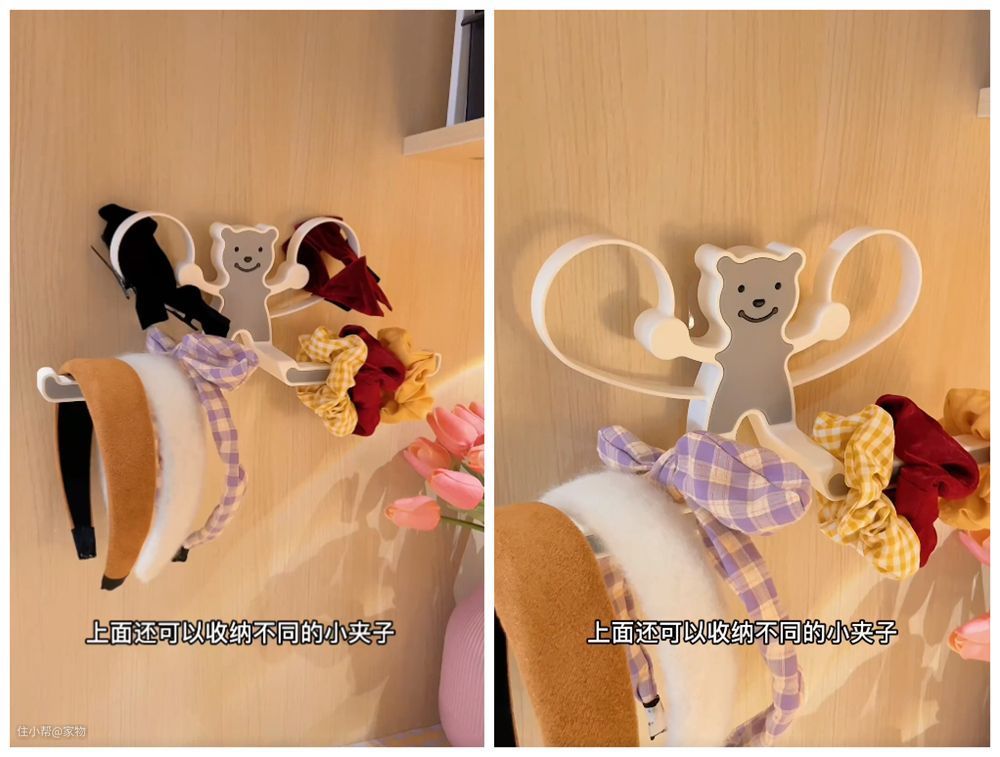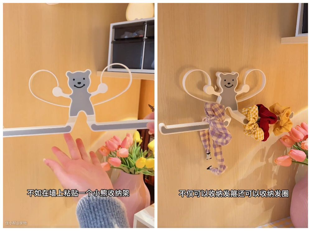 住在宿舍里的小仙女们,应该比较需要这个小熊造型的收纳架,它可以充分利用起墙面的空间,收纳一些头绳、发带之类的物品。