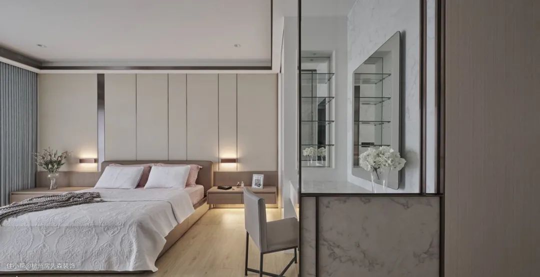 以沉稳的灰色为基调,缀上玻璃、木纹作为视觉焦点,床头覆上柔软绷布挹注轻奢质地,再利用百叶窗与壁灯的光晕,绘制丰富光影变化,构画低调优雅的现代设计!