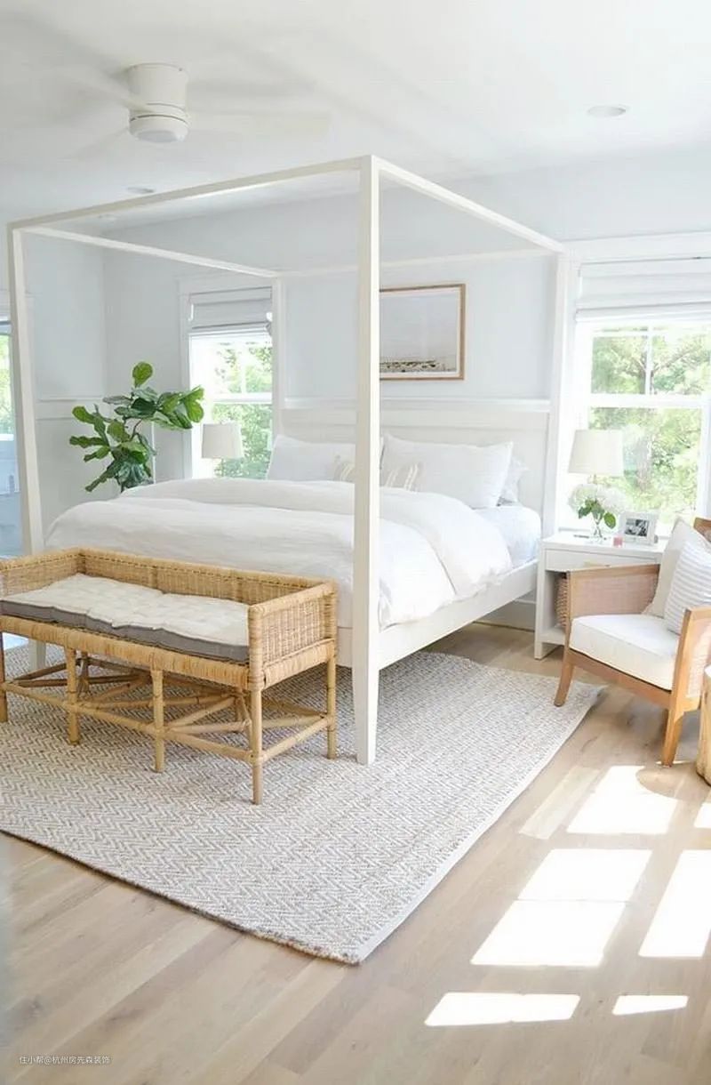 如果想别出心裁,可选择天蓬床设计的床架,角落的四柱支撑形成一个框架,搭佐窗纱、藤编制品,流露南洋度假风情,呈现与众不同的寝卧风貌。