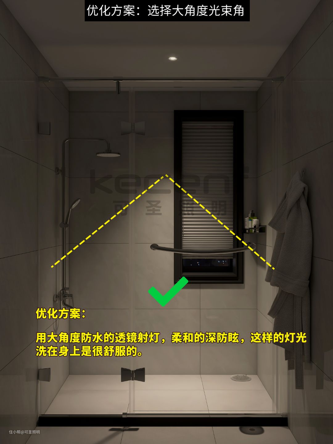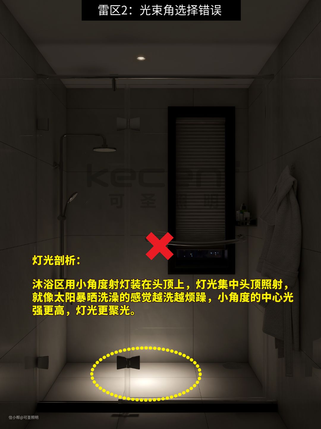 沐浴区用小角度射灯装在头顶上,灯光集中头顶照射,就像太阳暴晒洗澡的感觉越洗越烦躁,小角度的中心光强更高,灯光更聚光。