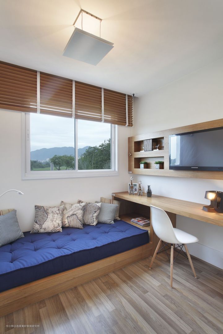 在常规设计中,习惯性的会把榻榻米和飘窗结合,紧靠飘窗摆放,如果想要两者在同一水平线上,那么需要注意榻榻米与飘窗窗台的高度,同时还需要注意垫子的厚度,因为这是造成高度差的主要原因;另外这样的设计会挡到窗户,每次开窗需要脱鞋爬到榻榻米上去开窗,较为麻烦。