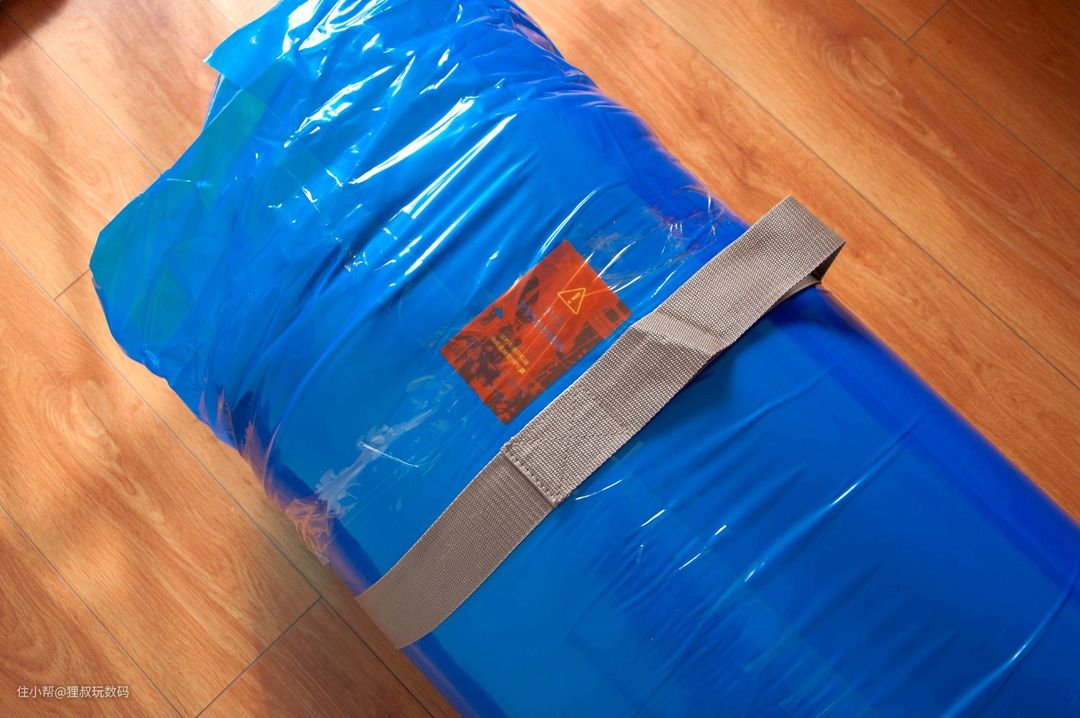 压缩盒装设计的好处就不用多说了吧,一方面方便运输,另一方面也更方便存放,如果你的新家正处在装修期,趁活动买回来后可以依墙摆放,一点也不占地方。8H蓝精灵无感释压床垫毛重43㎏,我自己一个人把它从客厅拎到卧室,揪着袋子可以轻松拽出来开箱,也挺方便。看到一侧贴的红色警示贴了吗?上面印着“小心请勿划伤面料”和“请用专用开包器,由此逐层划开PE膜”字样,让你知道从哪里下手拆包。