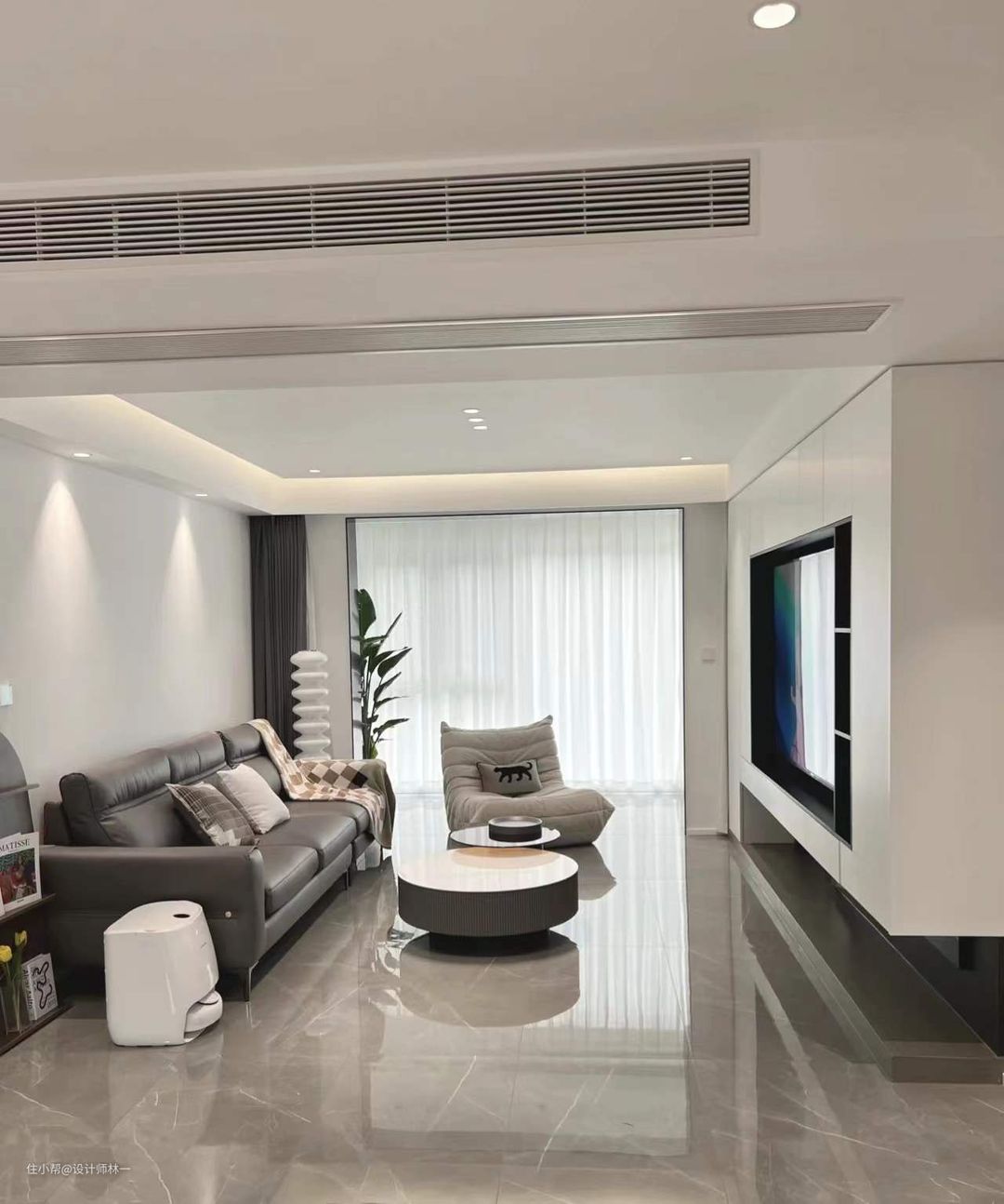 1.客厅设计了大平顶悬浮吊顶+无主灯设计,有拉升层高的效果;