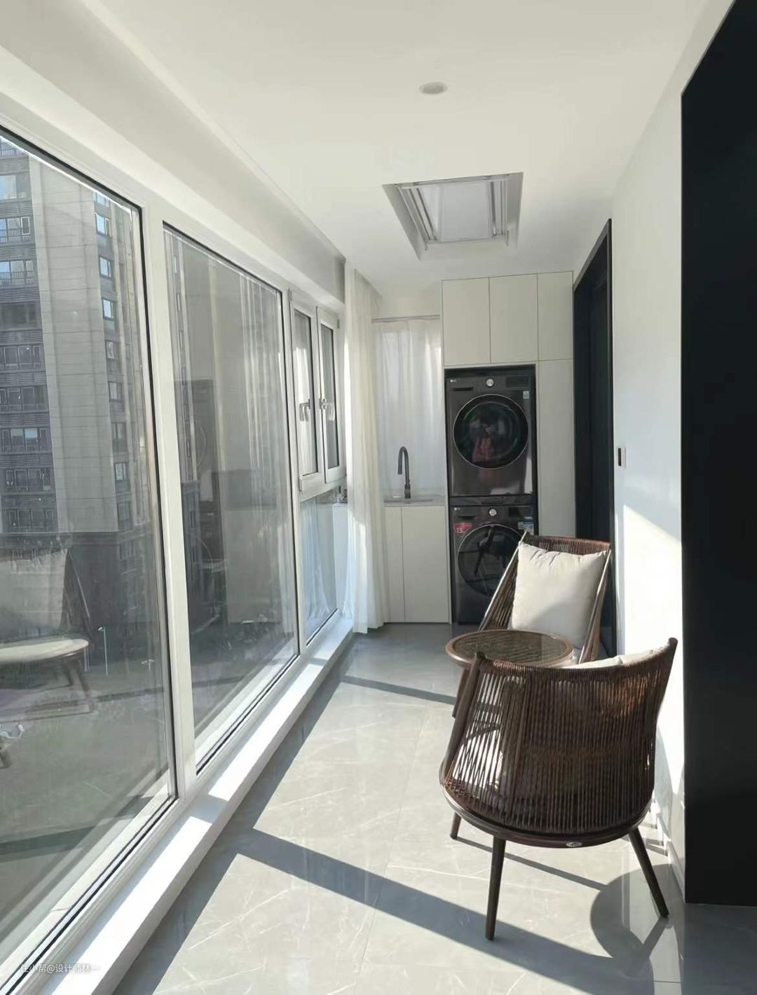 整个阳台长6.8m是双阳台,右边设计了洗衣区,定制了洗衣柜预留了洗衣机与烘干机叠放的尺寸,视觉上很有整体性,天花板上设计了智能晾衣架,很隐形不影响美观,具有多功能化,实用性强。