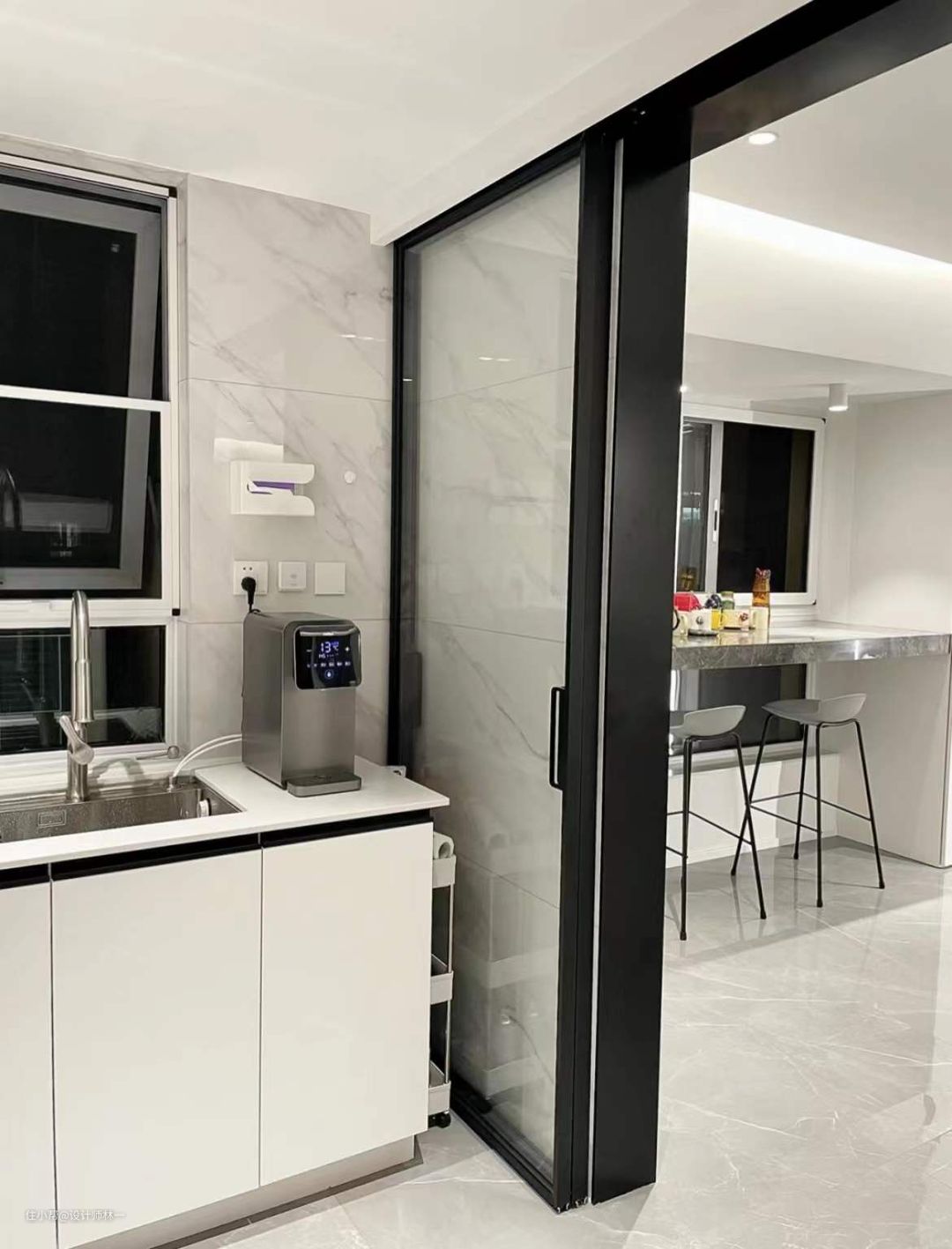 厨房做了移门,但是设计的是吊柜两联隐藏式,门打开是藏到右边墙体后面的,瞬间就变身开放式厨房,门关闭就是半开放式厨房,实现自由切换,墙体跟橱柜之间需要留有空隙来容纳移门,索性就留大一点,放置了30cm宽的收纳小推车,很实用!