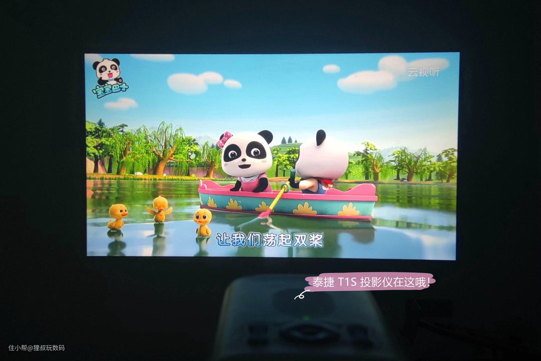 在投影画面上支持42寸-250寸的投射尺寸,让你满墙高清播放不再是梦。投射出的图像自然、柔和、平滑,并且不会有色彩分离的现象发生。在实际使用中,即使在有外部光源的环境下,泰捷WEBOX T1S投影仪在白墙上的显示效果也非常不错。投影仪开机后成了我儿子的最爱,在少儿模式里面找资源更方便了。他看到宝宝巴士的图标时说他三岁时就爱看这个,然后就点击开始回味了,没想到打开后完全是更新后的3D高清资源,还在那兴奋说的叫着“爸爸快看,这个是新的,我还没有看过呢!”,一口气看了十几集,虽然歌曲都是原来听过的,但画风完全变了,显示效果还可以吧。