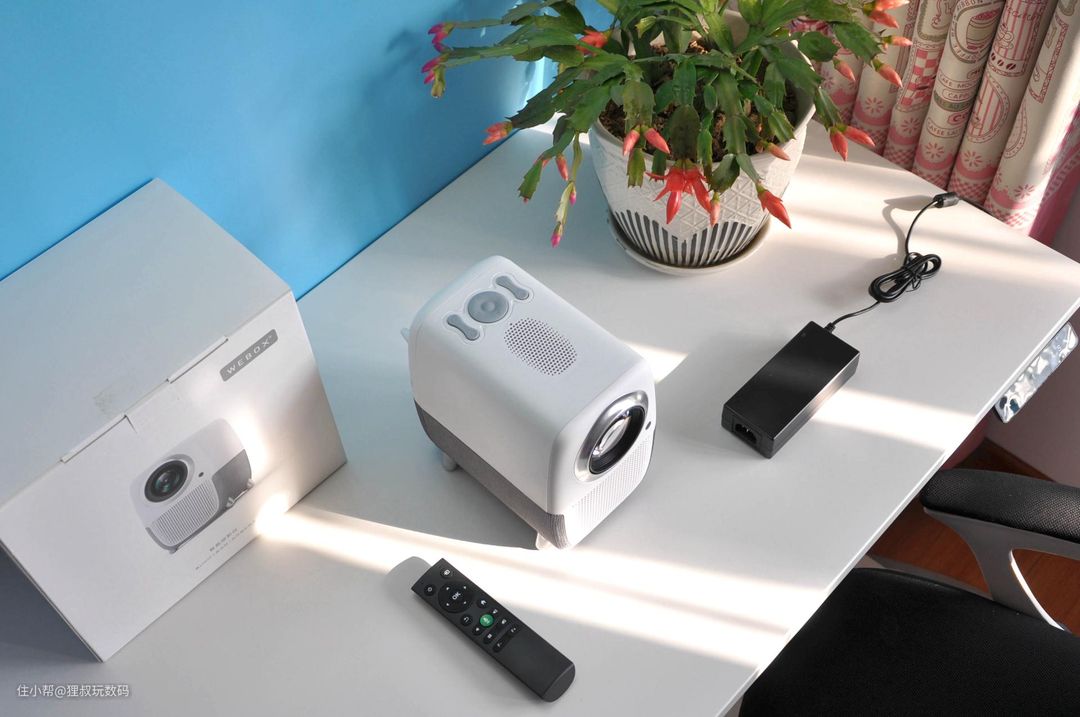 冬天哪哪光线都不太好,就趁着中午在我的书桌上给大家开箱吧。先瞅瞅它的全家福,箱内除了拥有一台 WEBOX T1S 投影仪外,还有电源适配器一套、AI语音遥控器一个、5号电池两节和使用说明书一份。配件非常简单,收到货后不用繁琐安装,通电后无论你是想把它摆在床头柜上,还是直接放在地板上都能用,我特别喜欢投在天花板上躺床上看,超级惬意。
