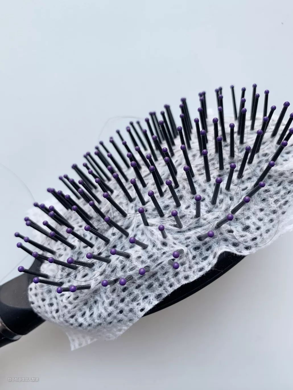 咱们可以用化妆棉片、干了的湿巾纸代替,卡在梳齿上,梳头,包住取下来扔掉。