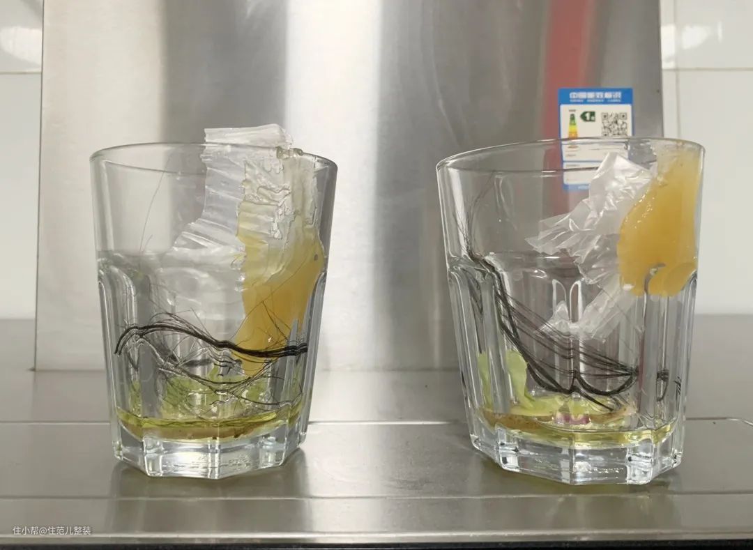 我用玻璃杯装了头发(不脱发女孩剪了一撮!)、土豆片、蔬菜叶、小片塑料袋、食用油,这些都是下水道常见的杂物。
