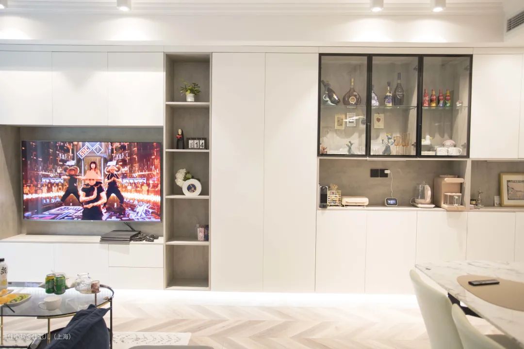 其他的像柜子通顶设计,开放式柜体遵循藏八露二或者安装玻璃柜门,视觉更清爽,积灰问题也不用太担心。