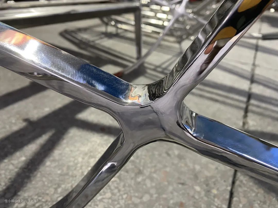 比如我们探厂看到过一个复刻巴塞罗那椅,主销欧洲,高端复刻的椅腿是两根钢管焊接、弧度柔和有张力,坐垫只有两条可见缝线。