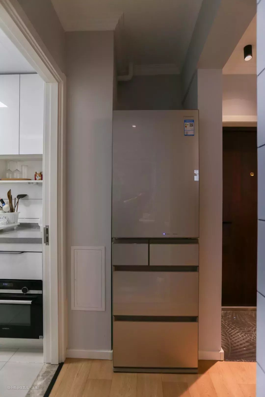 在这个住范儿的客户家,做了一个餐边柜,柜体到墙体留出冰箱的位置,刚好嵌入进来。