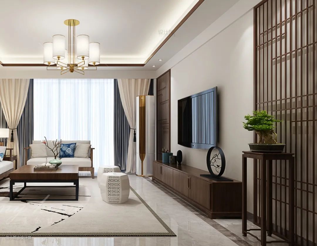 像在中式风格的电视墙设计上,可以在电视墙两侧加入对称的屏风或木饰面,以独特的造型来营造出空间的中式风格效果。