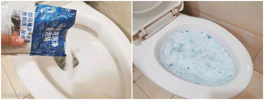 白色粉末遇水后迅速起泡,蓝色的泡沫充盈着整个马桶内壁,不留死角。静置4个小时后,马桶就会大变身。上班前或者晚上睡觉前倒上一包,下班或者睡醒后,马桶就清洁完毕了,不会耽误日常的生活。