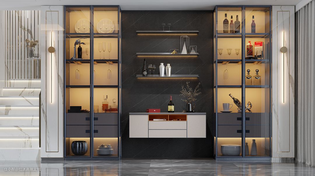 拉迷以“独具匠心,海派轻奢”为设计理念,将金属、玻璃,皮革与木板等设计元素,组合出现在柜体之上,也造就了不同的空间风格。摒弃繁杂的形式主义,用工艺与细节来表达价值感,在人性化的设计中提供更高品质的享受,从而传达一种轻奢感。
