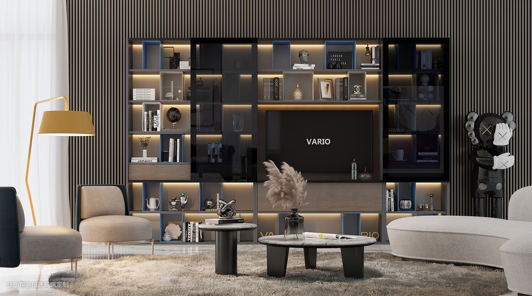格栅背景与金属层板之间可以起到调节、缓冲的作用,使空间看起来丰富而不拥挤,在灯光的烘托下,整个柜子又多了一些柔软的气息。