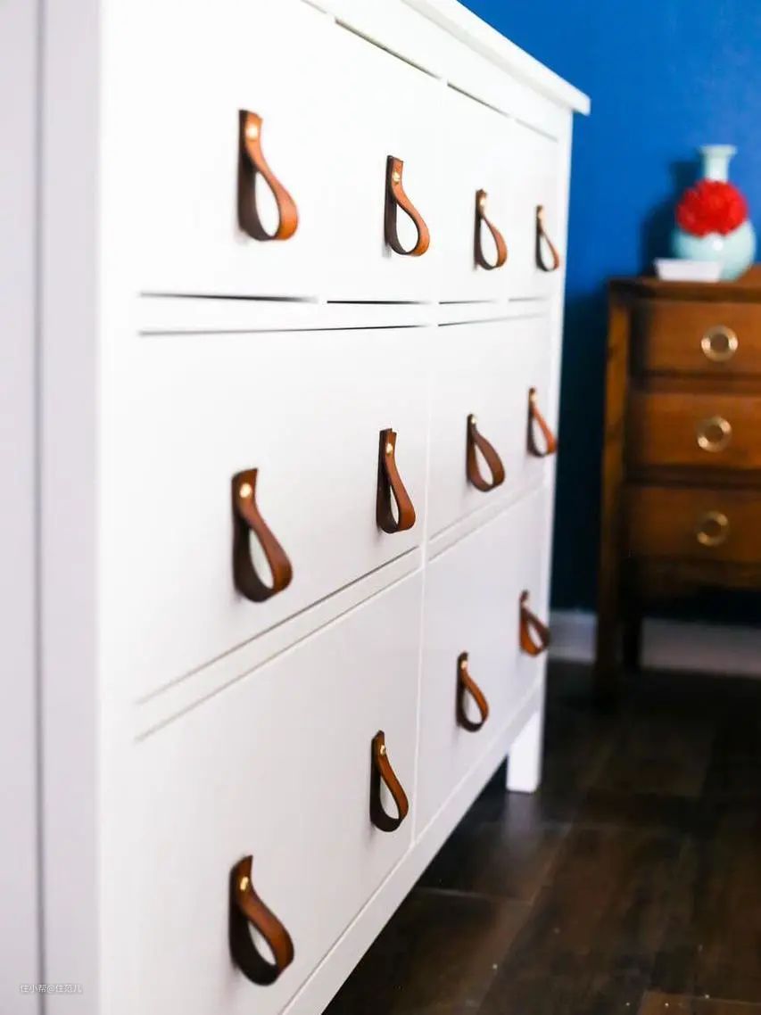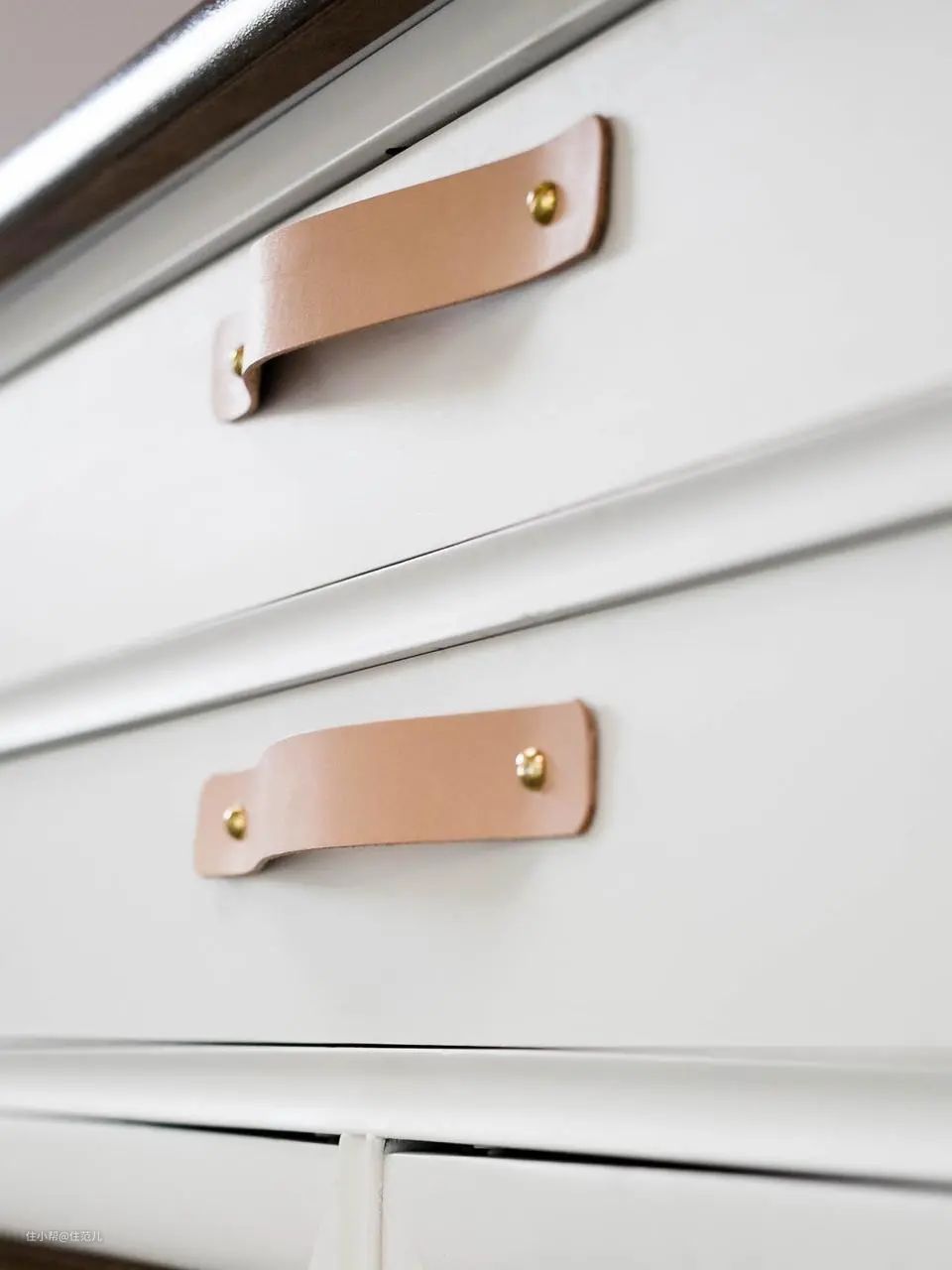 总得来说,皮拉手更适合带抽屉的柜子来使用,用在衣柜上肯定是没有硬拉手用得顺手。只是尽量不要用在橱柜和浴室柜上,因为没有防水性。