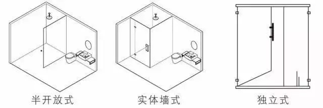 三式分离一般是在同一个大空间内,通过隔断或一定距离,把如厕区、洗漱区、淋浴区三个功能区区分开来。
